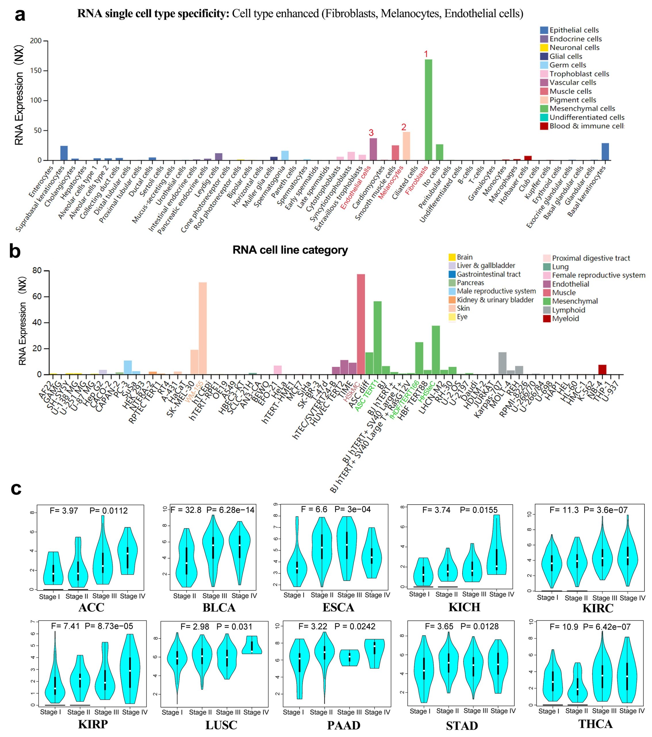 - Additional file 2: Figure S2. CTHRC1 expression levels in different normal cells, cancer cells and pathological stages of various cancers. We analyzed the expression of the CTHRC1 mRNA in different normal cells a or in different cancer cells (b); c Expression levels of the CTHRC1 mRNA in different pathological stages of ACC, BLCA, ESCA, KICH, KIRC, KIRP, LUSC, PAAD, STAD, THCA. (TIF)