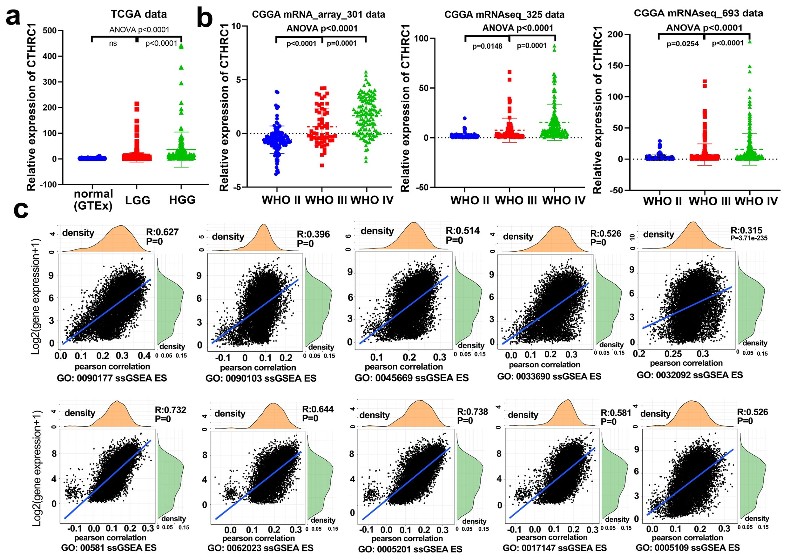 - Additional file 3: Figure S3. CTHRC1 mRNA expression in glioma of different grades and a single-gene GO analysis of CTHRC1. a The expression levels of CTHRC1 mRNA were analyzed in normal brain and glioma tissues of different grades from GTEx and TCGA databases; b The expression levels of CTHRC1 mRNA were analyzed in glioma of different grades in CGGA cohort (mRNA_array_301, mRNAseq_325 and mRNAseq_693 data); (c) CTHRC1 expression is positively associated with each analysis result. (TIF)