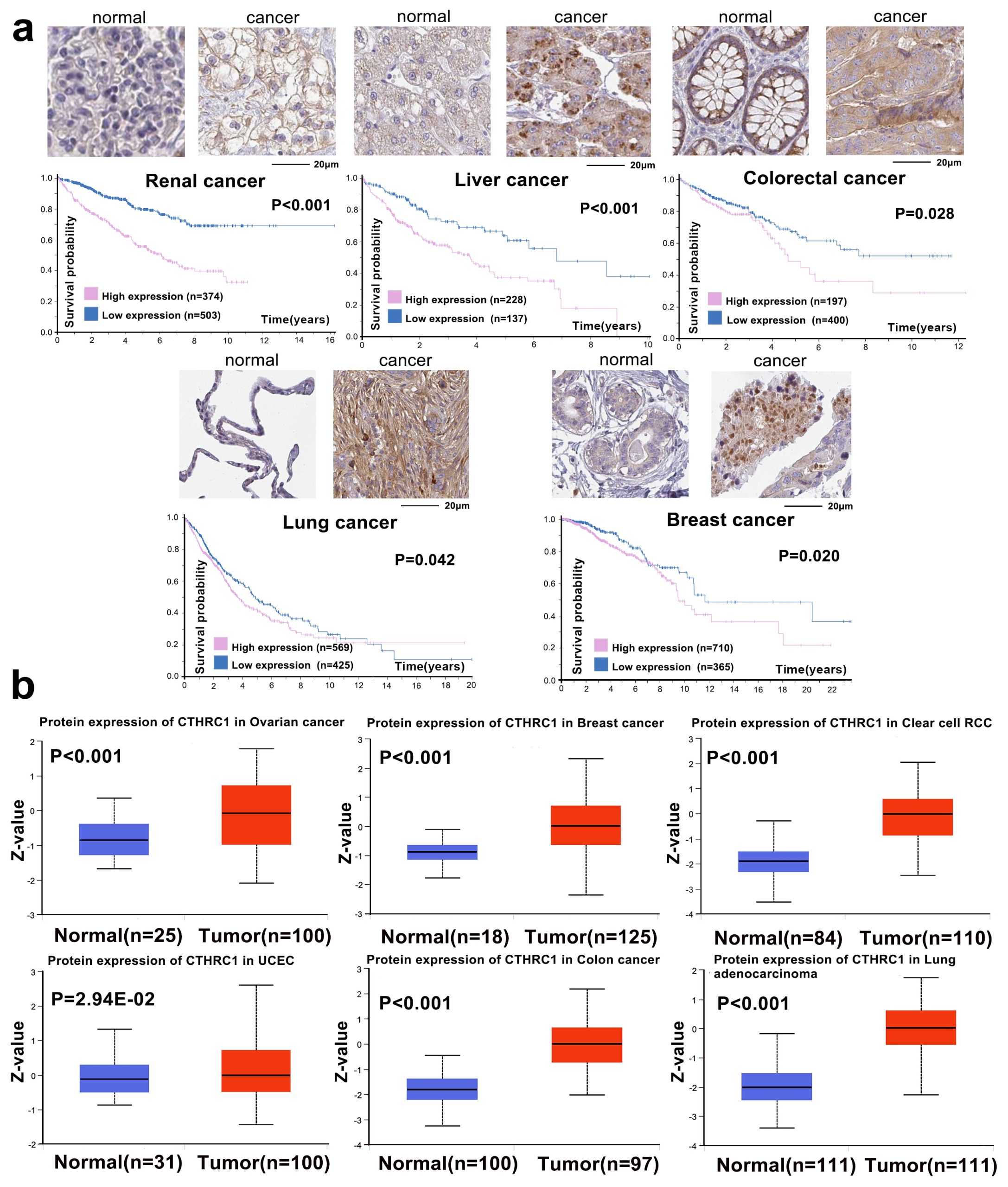 - Additional file 4: Figure S4. The immunohistochemical staining, protein expression level and prognosis of CTHRC1 protein in different tumors. a Immunohistochemical staining of CTHRC1 protein in renal, liver, colorectal, prostate, lung and breast cancers, and correlation between CTHRC1 protein expression and survival prognosis of these cancers. b The level of CTHRC1 protein is higher in ovarian, breast and colon cancers, and clear cell RCC, UCEC, LUAD than in adjacent normal tissues. Z-values represent standard deviations from the median across samples for the given cancer type. Log2 Spectral count ratio values from CPTAC were firstly normalized within each sample profile, then normalized across samples. (TIF)