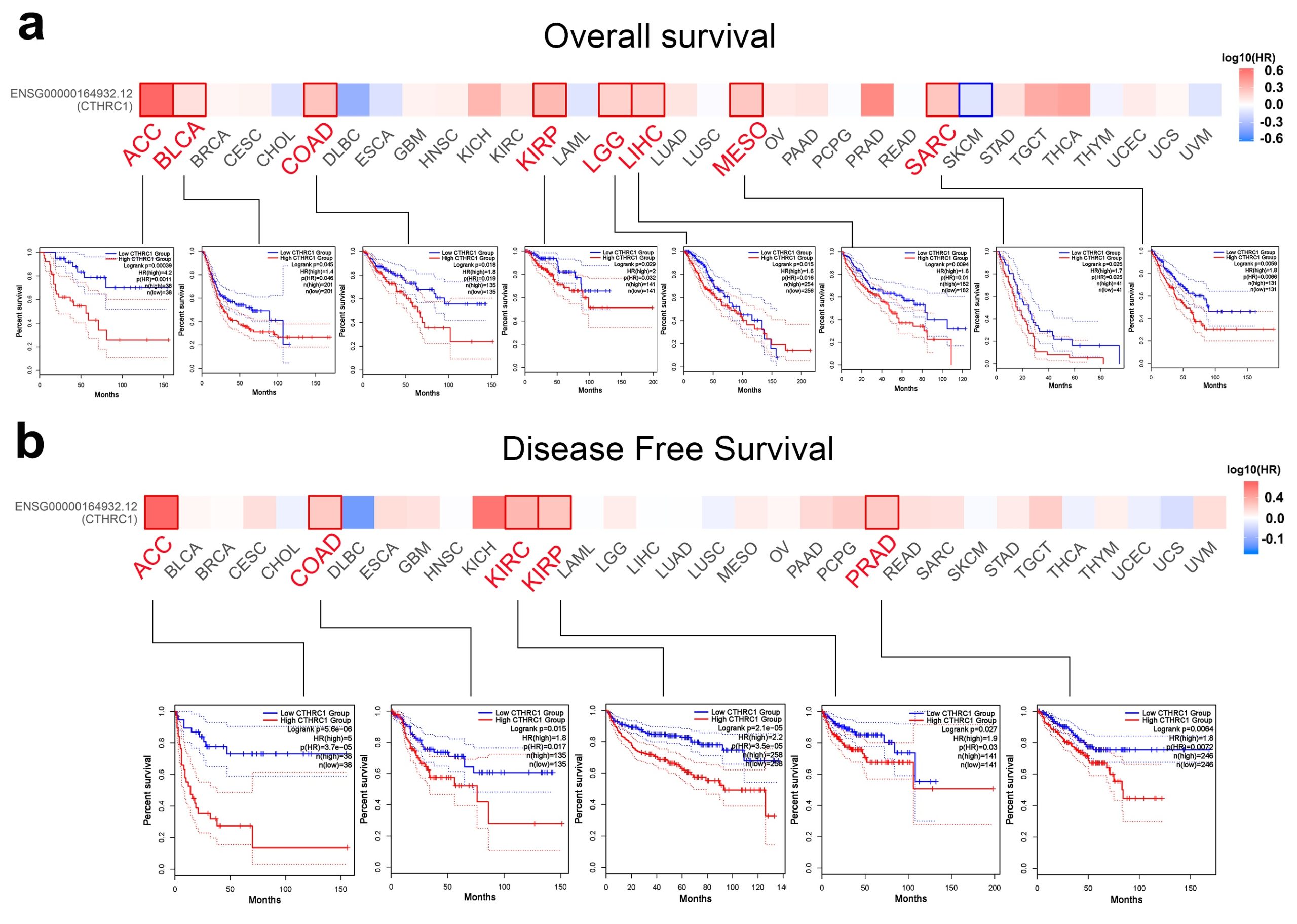 - Additional file 5: Figure S5. Correlation between CTHRC1 mRNA expression and survival prognosis of cancers in TCGA. We used the GEPIA2 tool to perform overall survival a and disease-free survival b analyses of different tumors in TCGA by CTHRC1 gene expression. The survival map and Kaplan–Meier curves with positive results are given. (TIF)