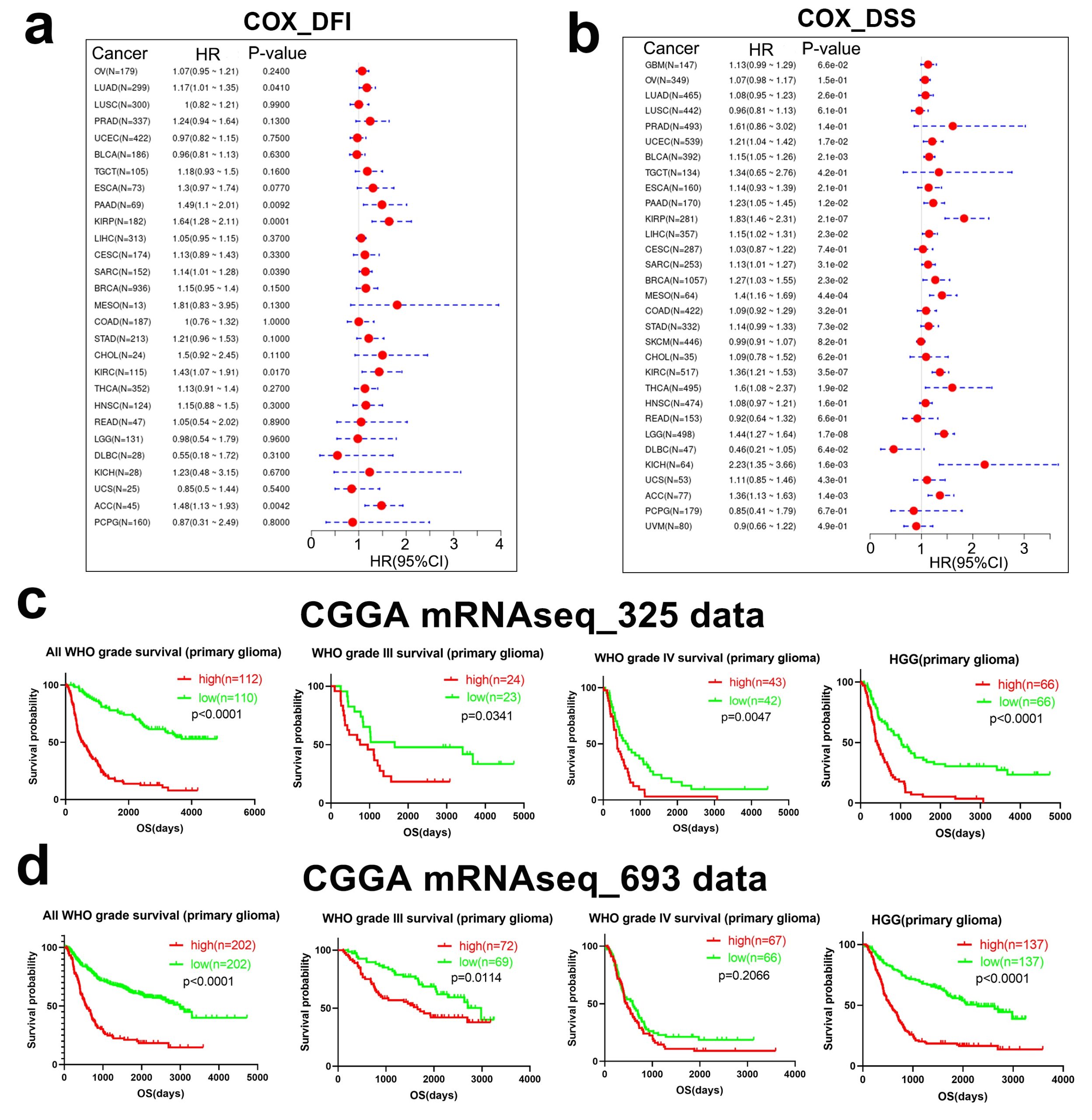 - Additional file 6: Figure S6. Correlation between CTHRC1 mRNA expression and survival prognosis. The relationships between CTHRC1 expression and DFI a or DSS b prognosis of different cancers in “Gene-KM plotter” module of SangerBox; (c) A Kaplan–Meier survival curve was used to examine the expression of CTHRC1 on the all WHO grade primary glioma, WHO grade III, WHO grade IV primary glioma and HGG primary glioma survival in the CGGA cohort (mRNAseq_325, mRNAseq_693 data). (TIF)