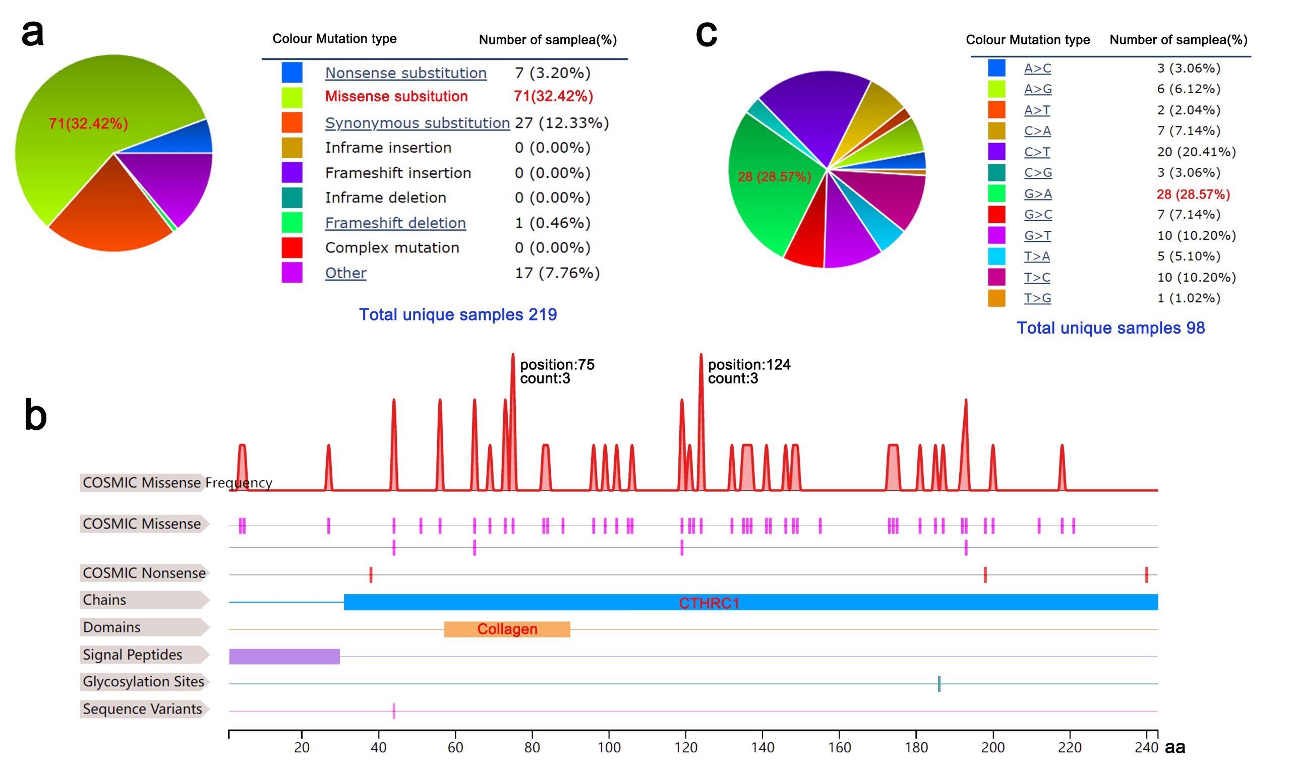 - Additional file 7: Figure S7. CTHRC1 mutation analysis. The main mutation type a and mutation sites b of CTHRC1 were analyzed via COMIC database. c The primary SNV class type was G > A. (TIF)