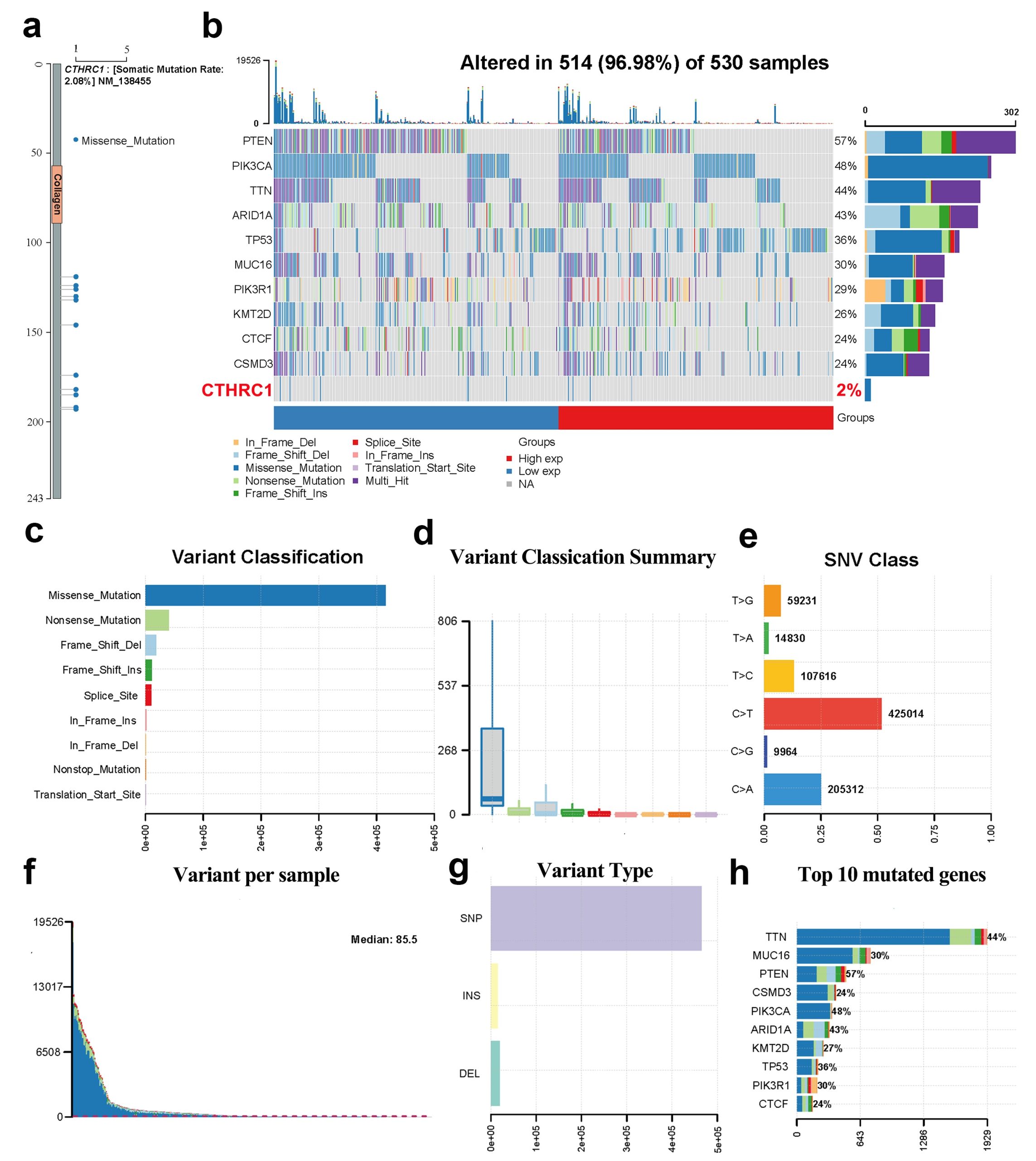 - Additional file 8: Figure S8. CTHRC1 alteration in UCEC. a Lollipop plot displaying mutation distribution and protein domains for CTHRC1 in cancer with the labeled recurrent hotspots. Somatic mutation rate and transcript names are indicated by plot title and subtitle, respectively. b Oncoplot displaying the somatic landscape of UCEC cohort. Genes are ordered by their mutation frequency, and samples are ordered according to disease histology as indicated by the annotation bar (bottom). Side bar plot shows log10 transformed Q-values estimated by MutSigCV. Landscape of mutation profiles in UCEC samples. Mutation information of each gene in each sample was shown in the waterfall plot, where different colors with specific annotations at the bottom meant the various mutation types. The barplot above the legend exhibited the number of mutation burden. According to UCEC samples, cohort summary plot displaying distribution of variants according to variant classification (c), variant classification type d) and SNV class e. Bottom part indicates mutation load for each sample (f), variant type (g); A stacked barplot shows top ten mutated genes (h). (TIF)