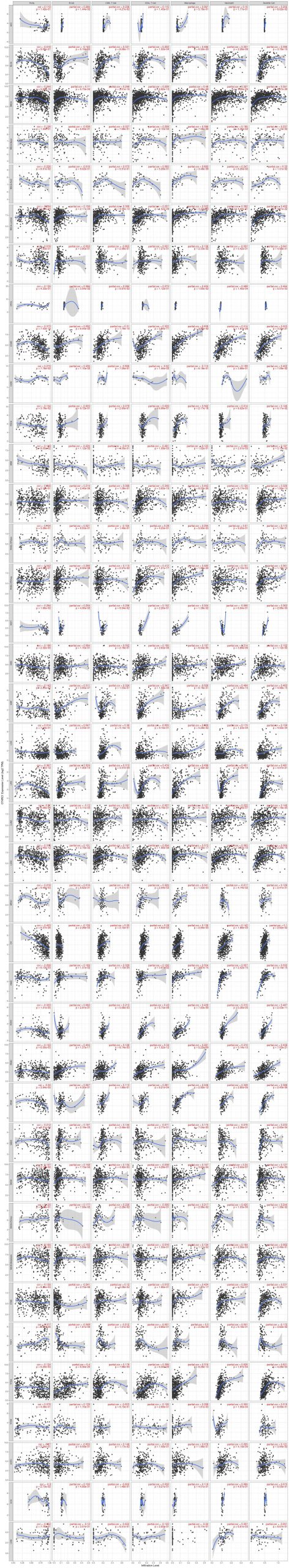 We logged on to the online Tumor Immune Estimation Resource (TIMER) portal (https://cistrome.shinyapps.io/timer/) to analyze the abundance of TIICs from gene expression profiles obtained from TCGA cancer cases [ref. 34, ref. 35]. Using the “gene” module in TIMER, we analyzed the association of CTHRC1 expression with the abundance of infiltrating immune cells, including CD8 + T cells, CD4 + T cells, B cells, neutrophils, macrophages, and dendritic cells. We then used the “Immune-Gene” module of TIMER2 to explore the association between CTHRC1 expression and CD8 + T cell infiltration. The “Purity Adjustment” option was selected to perform Spearman’s correlation analysis. The results for different cancer types are shown in a heatmap with numbers. A scatter plot that presents the relationship between the infiltrate estimation value and gene expression in different cancers was obtained by clicking the cells on the heatmap. We obtained the P-values and partial correlation (cor) values.