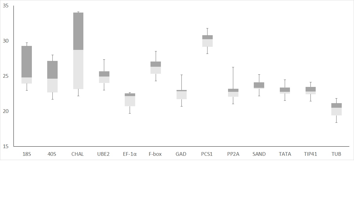 | 11 | GAD | CHAL | GAD | UBE2 | CHAL | TATA | PP2A | TATA | 18S | PCS1 | CHAL | CHAL | UBE2 | TUB | 40S |
