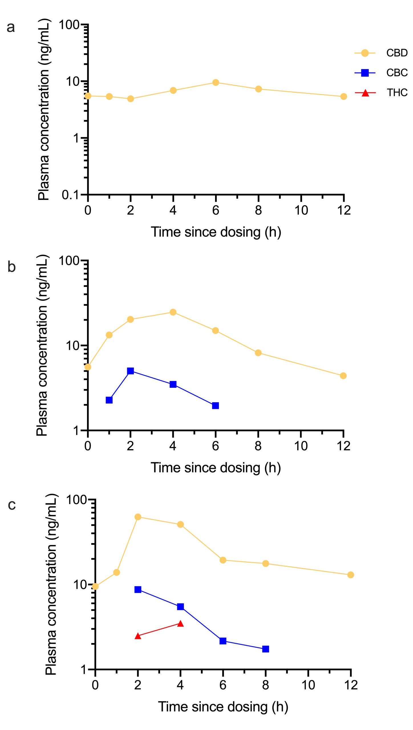 As the presence of CBC appears common at low levels in CBD oils [ref. 22], it is important for future studies to compare the individual PK of CBD as well as CBC when administered as isolates to humans, to that of a product containing both CBD and CBC. Future studies should also investigate the effects of CBC on drug metabolism pathways, and should elucidate potential mechanisms underlying any interaction of multiple phytocannabinoids on pharmacokinetics, including rate and extent of absorption, competition for plasma protein binding, and inhibition/induction of cytochrome P450s that impact metabolism as well as of active drug transporters. Because this was a pilot study, a full pharmacokinetic study of CBC, including urinary excretion of CBC, is warranted.