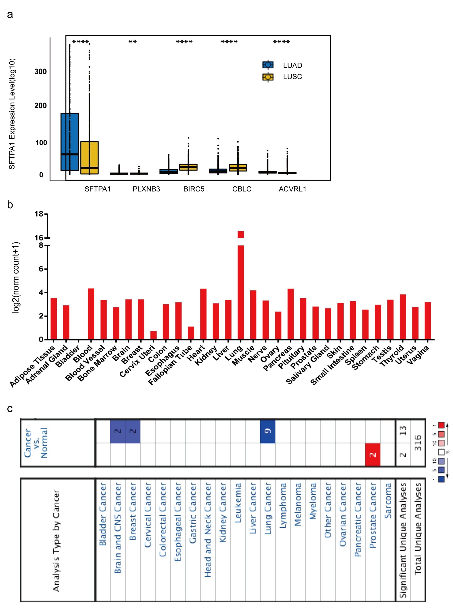 - Figure S1. SFTPA1 expression pattern in human tissues. a. The level of mRNA expression in six candidate reference genes. b.The mRNA expression profile of SFTPA1 in human normal tissues using the GTExPOrtal database. c. SFTPA1 mRNA expression in human tumors using the publicly available Oncomine database (P < 0.01; fold-change > 2)Supplementary file1 (TIF 16016 KB) (TIF)