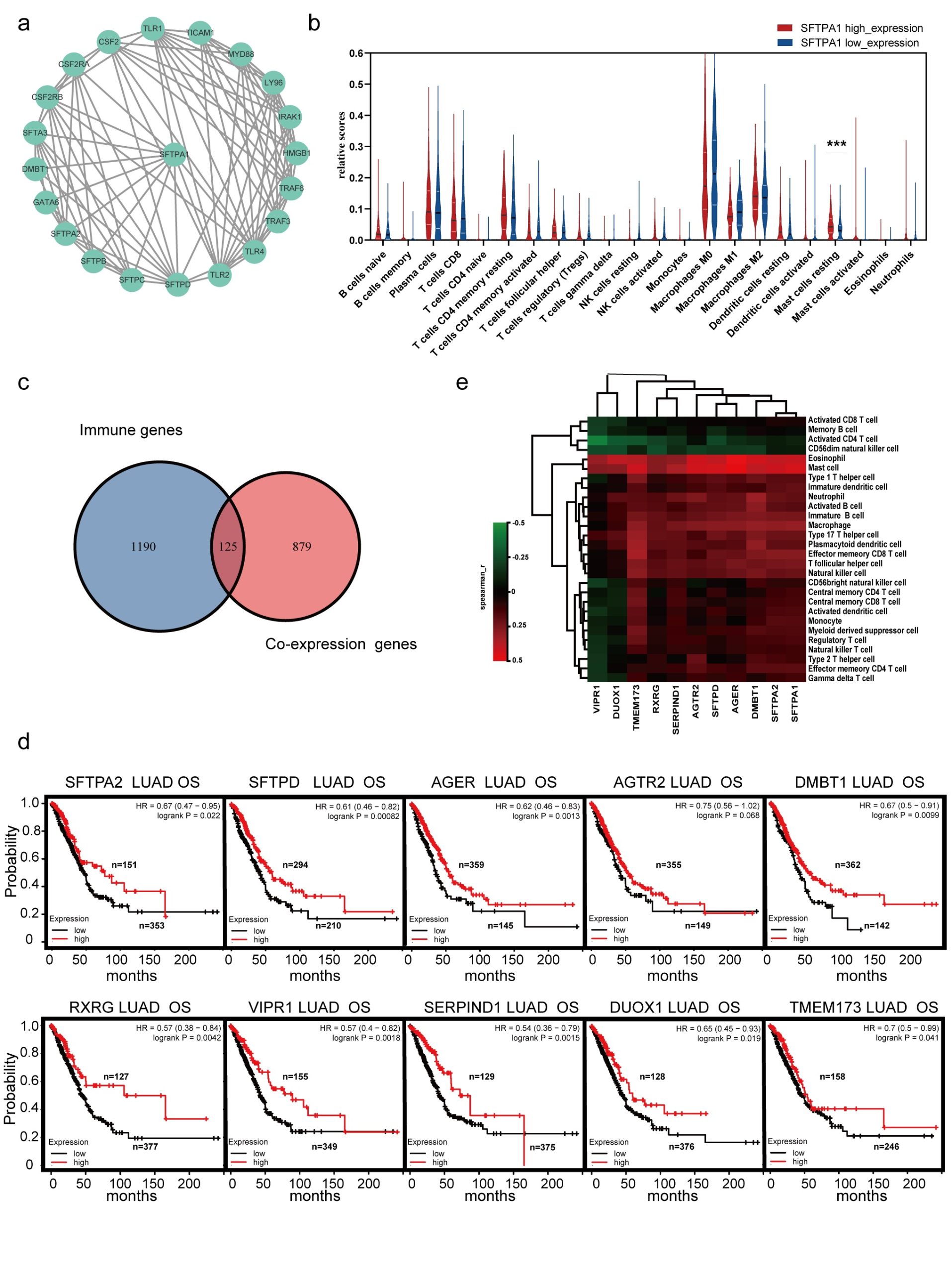 - Figure S2. SFTPA1 co-expression genes and prognosis. a. Protein-protein interaction (PPI) network of SFTPA1 co-expression genes by STRING. b. There were 22 immune cell subpopulations in the SFTPA1-high expression group compared with the SFTPA1-low expression group in LUSC. (t test, P value Significant Codes: 0 ≤ *** < 0.001 ≤ ** < 0.01 ≤ * < 0.05). c. Venn diagram of immune-related genes and co-expression genes of SFTPA1 in TCGA LUAD. d. Heatmap of the correlation between the top 10 SFTPA1-related immune genes and immune cell infiltration landscape in TISIDB. e. Correlation between the expression of the top 10 immune SFTPA1-related genes and OSSupplementary file2 (TIF 16216 KB) (TIF)