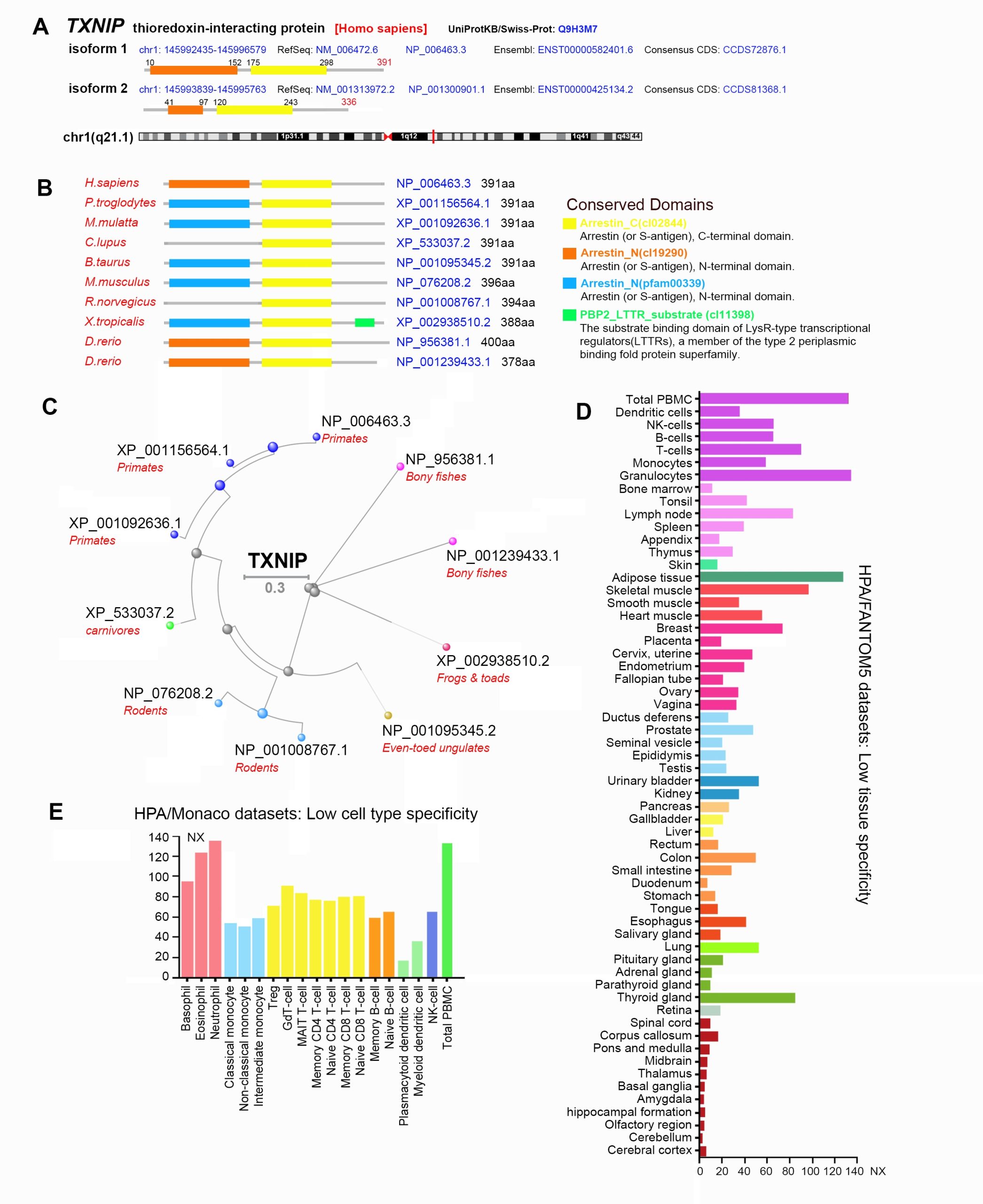 To conduct a comprehensive analysis of human TXNIP (NM_006472.6 for mRNA, NP_006463.3 for protein, data relating with its genome location, conserved functional domain and the phylogenetic tree were obtained (Additional file 1: Fig. S1A–C). As shown in Additional file 1: Fig. S1D, the levels of mRNA expression of TXNIP shows a low tissue specificity with all normalized expression values in detected tissues > 1. Then, a low cell type specificity of TXNIP expression in different blood cells is also observed (Additional file 1: Fig. S1E).