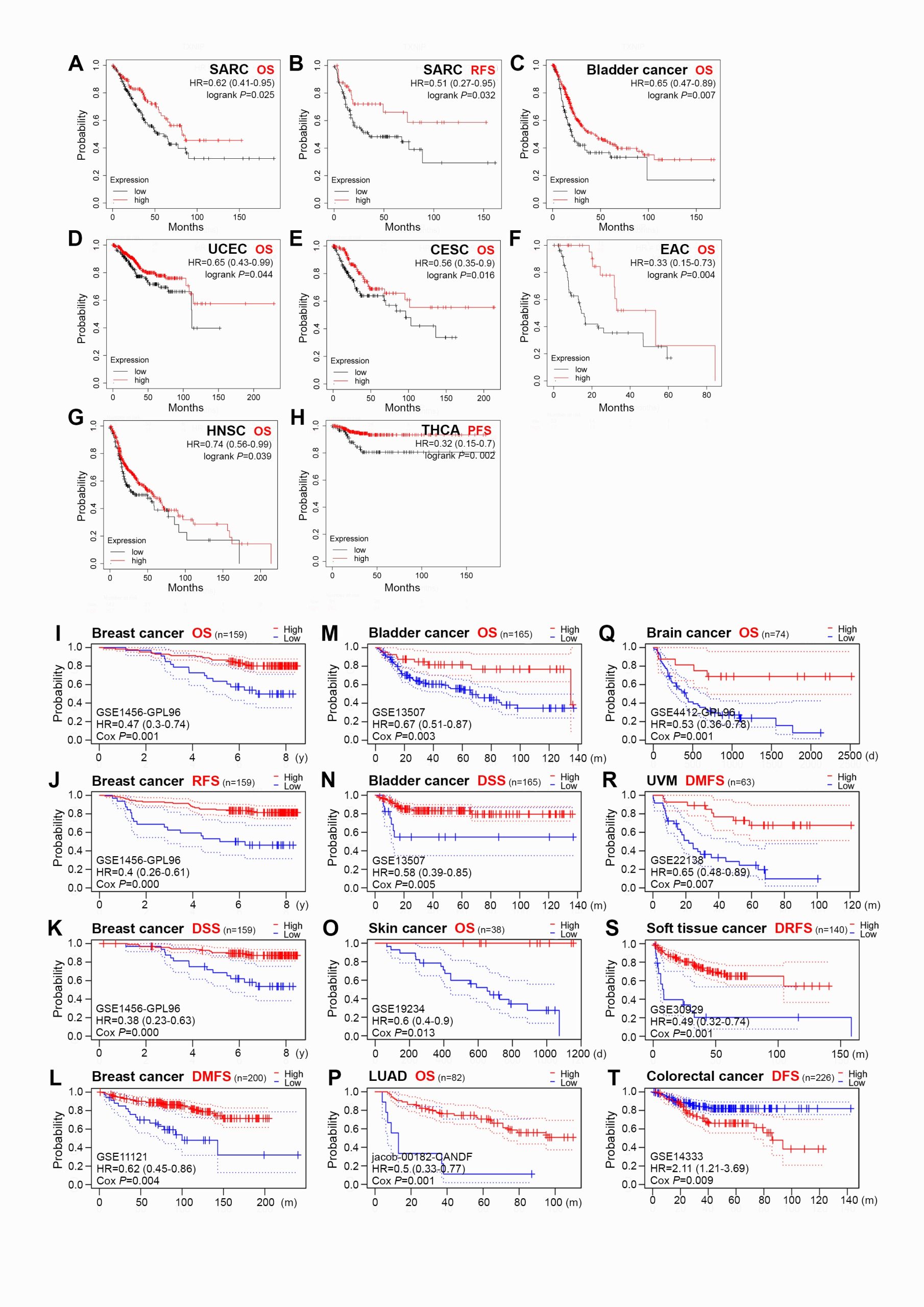 - Additional file 2: Figure S2. Survival curves comparing the high and low expression of TXNIP in different tumors in the Kaplan–Meier plotter (A–H) and PrognoScan databases (I–T). (TIF)
