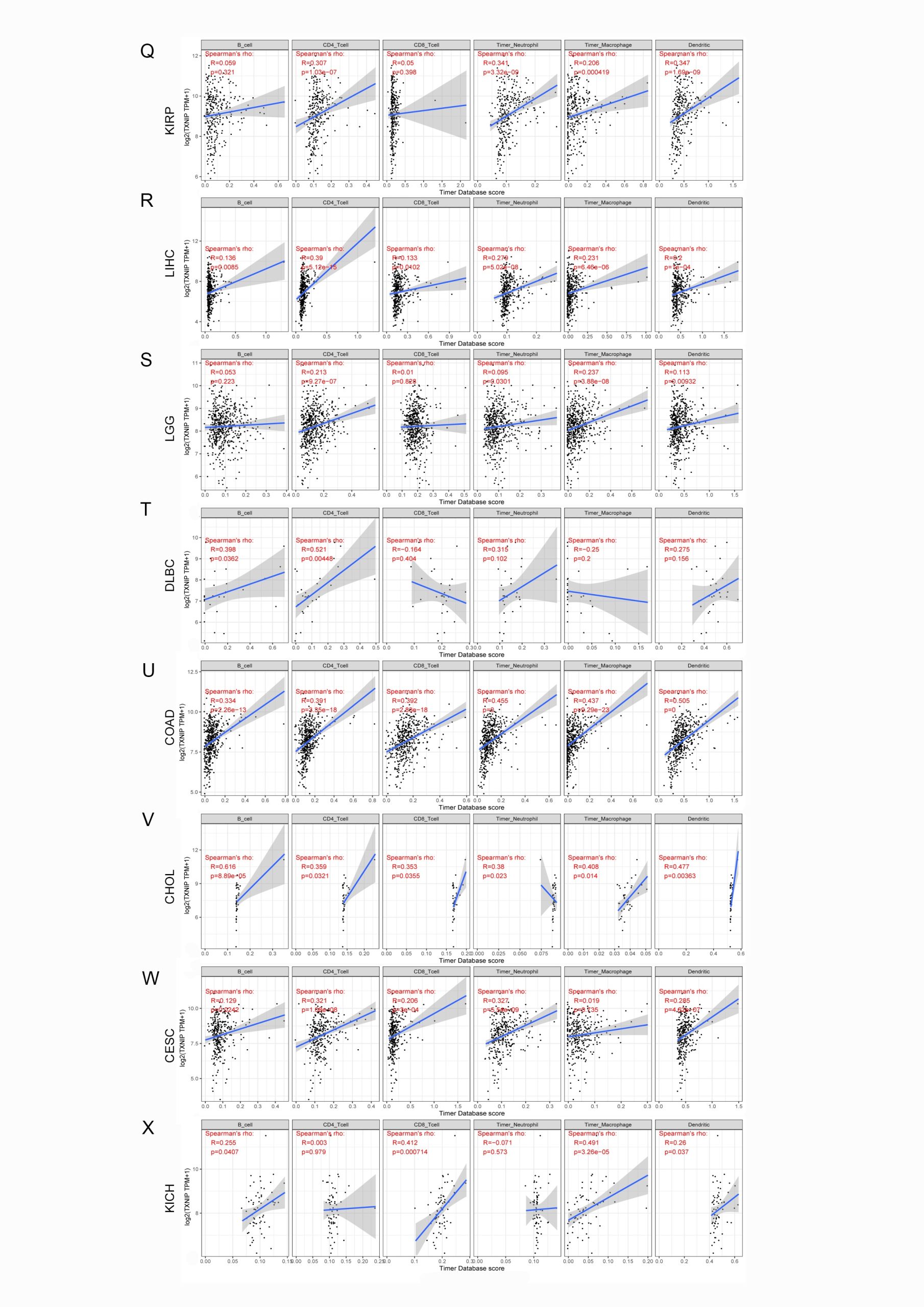 - Additional file 5. Correlation of TXNIP expression with tumor-infiltrating immune cells in KIRP, LIHC, LGG, DLBC, COAD, CHOL, CESC and KICH via the TIMER2 database. (TIF)