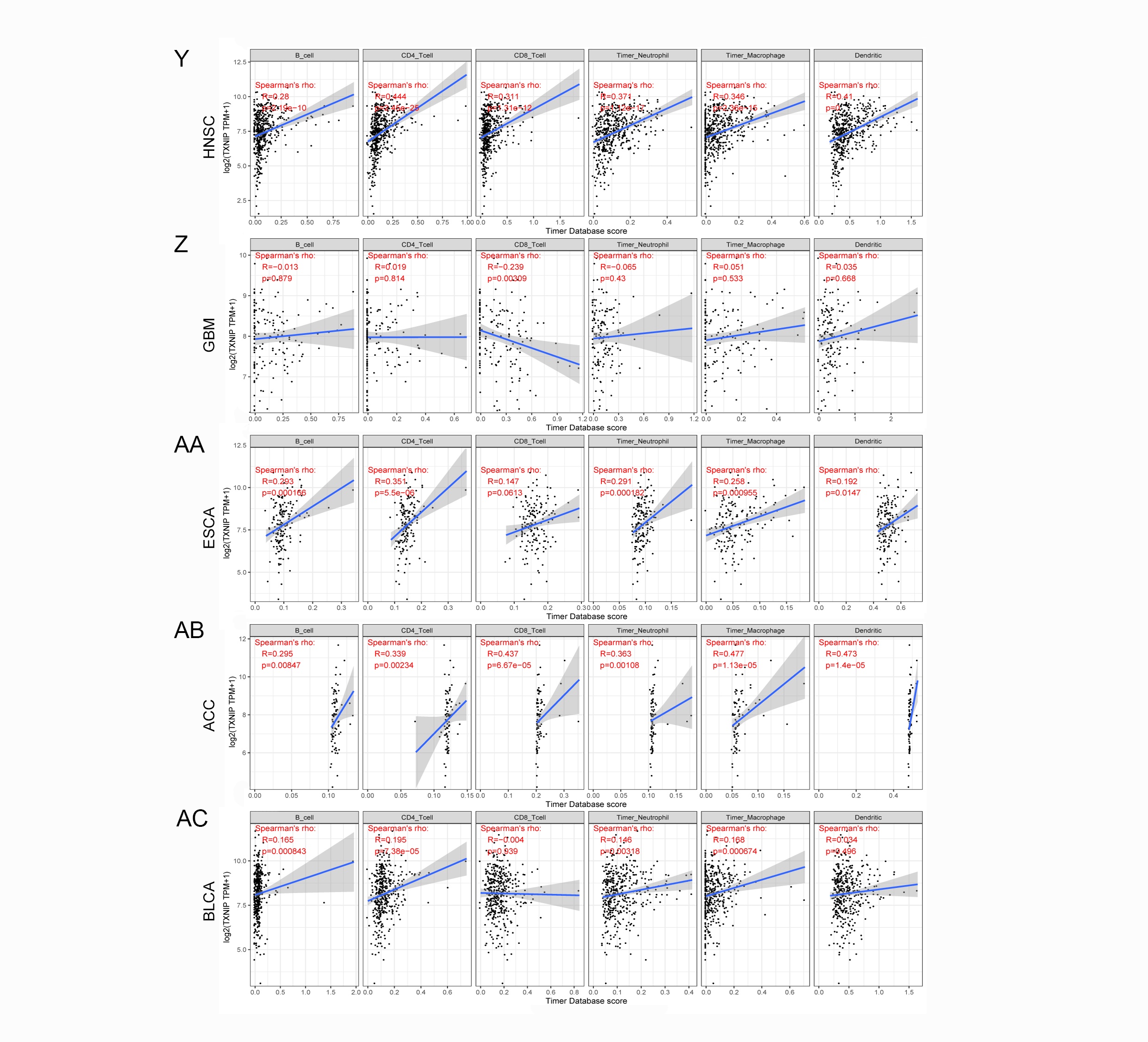 - Additional file 6. Correlation of TXNIP expression with tumor-infiltrating immune cells in HNSC, GBM, ESCA, ACC and BLCA via the TIMER2 database. (TIF)