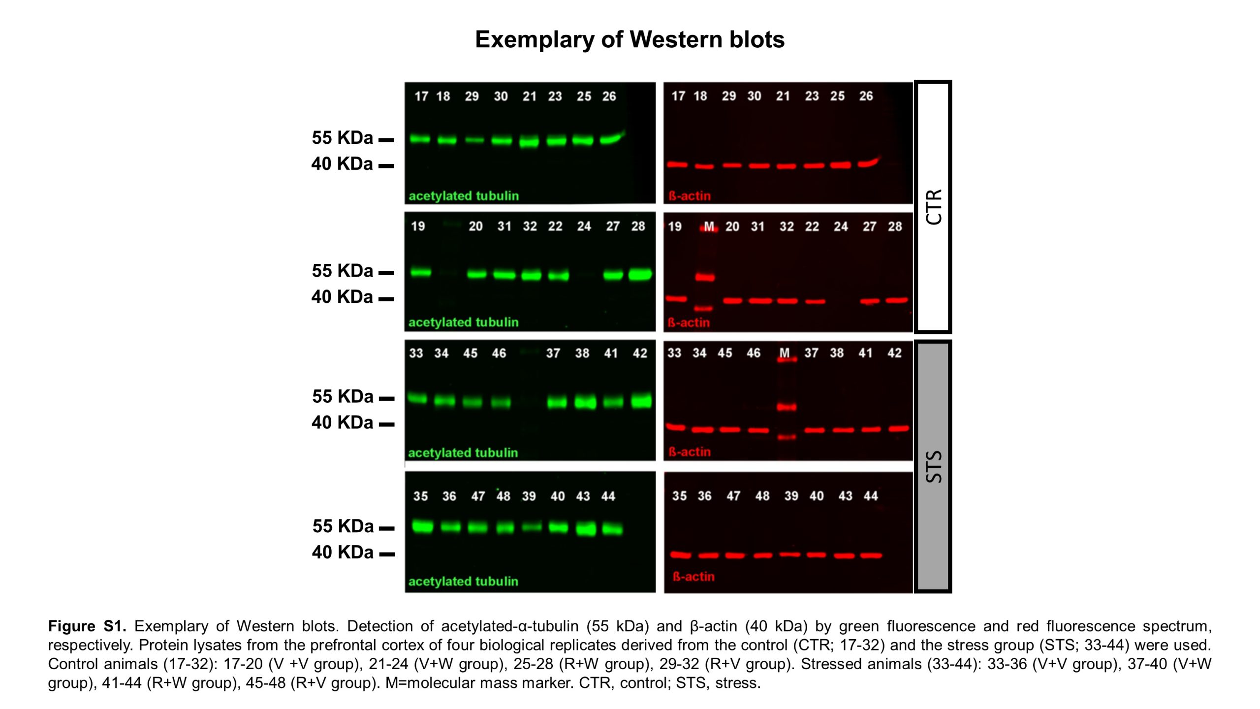 - Exemplary of Western blots.Detection of acetylated-α-tubulin (55 kDa) and β-actin (40 kDa) by green fluorescence and red fluorescence spectrum, respectively. Protein lysates from the prefrontal cortex of four biological replicates derived from the control (CTR; 17–32) and the stress group (STS; 33–44) were used. Control animals (17–32): 17–20 (V +V group), 21–24 (V+W group), 25–28 (R+W group), 29–32 (R+V group). Stressed animals (33–44): 33–36 (V+V group), 37–40 (V+W group), 41–44 (R+W group), 45–48 (R+V group). M = molecular mass marker. CTR, control; STS, stress.(TIF) (TIF)