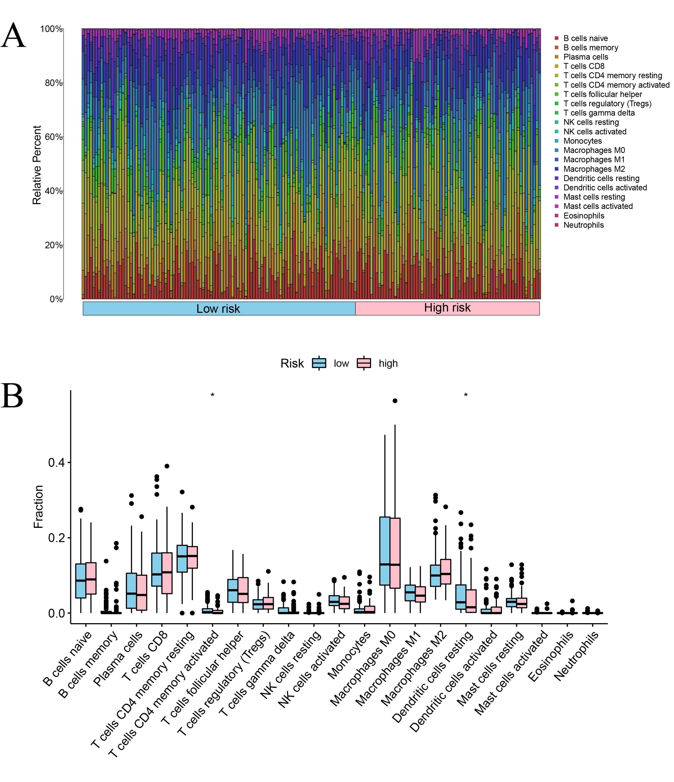 - Additional file 1: Figure S1. Tumor-infiltrating immune cells in different risk subgroups. A The abundance of 21 immune cells between high- and low-risk groups. B Differences in fractions of tumor-infiltrating immune cells between two risk subgroups. (TIF)