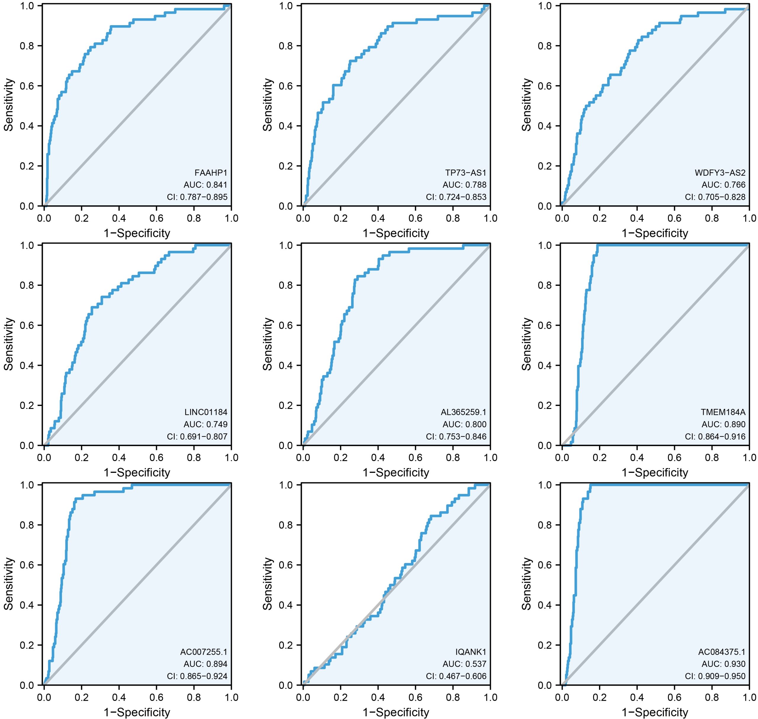 - Additional file 2: Figure S2. The diagnostic values of 9 eRNAs for THCA patients. (TIF)