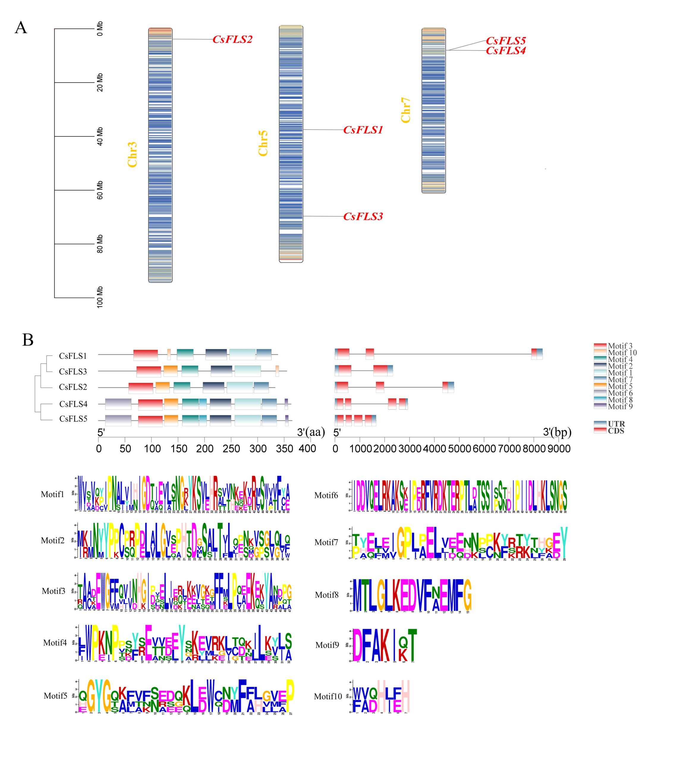 TBtools software was used to investigate the chromosomal location of CsFLS genes and their distribution of exons and introns. Motif conserved motifs (motif parameter set to 10) were predicted using the MEME [ref. 54].