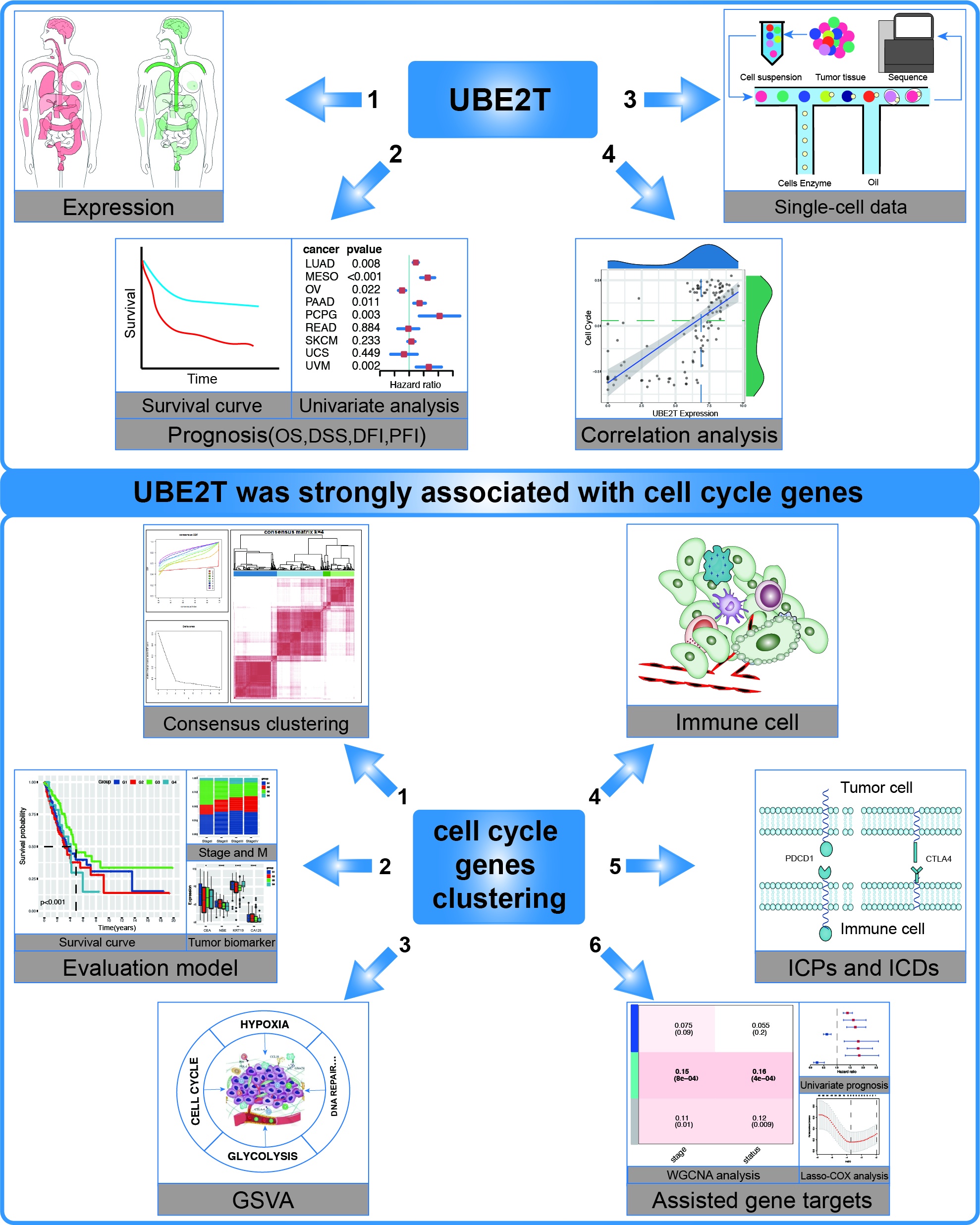 We first analyzed UBE2T across 33 tumor types in The Cancer Genome Atlas (TCGA) project. We investigated the expression level of UBE2T and its effect on prognosis using the TCGA database. The correlation between UBE2T and cell cycle in pan-cancer was investigated using the single-cell sequencing data in Cancer Single-cell State Atlas (CancerSEA) database. The Weighted Gene Co-expression Network analysis (WGCNA), Univariate Cox and Least absolute shrinkage and selection operator (LASSO) Cox regression models, and receiver operating characteristic (ROC) were applied to assess the prognostic impact of UBE2T-related cell cycle genes (UrCCGs). Furthermore, the consensus clustering (CC) method was adopted to divide TCGA-lung adenocarcinoma (LUAD) patients into subgroups based on UrCCGs. Prognosis, molecular characteristics, and the immune panorama of subgroups were analyzed using Single-sample Gene Set Enrichment Analysis (ssGSEA). Results derived from TCGA-LUAD patients were validated in International Cancer Genome Consortium (ICGC)-LUAD data.
