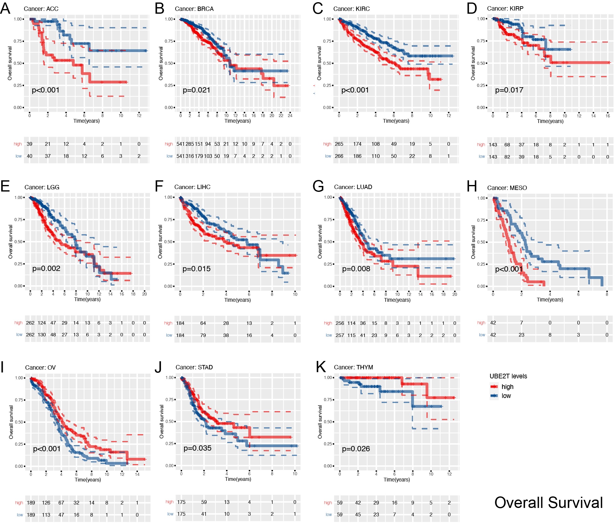 - Additional file 2: Figure S2. Association between UBE2T gene expression and overall survival (OS) of 33 different types of tumors in TCGA database. A-K. Significant association between UBE2T and OS of ACC (A), BRCA (B), KIRC (C), KIRP (D), LGG (E), LIHC (F), LUAD (G), MESO (H), OV (I), STAD (J), and THYM (K). (TIF)