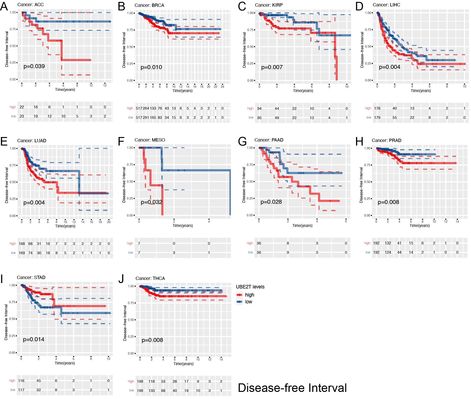 - Additional file 4: Figure S4. Association between UBE2T gene expression and disease free interval (DFI) of 33 different types of tumors in TCGA database. A-J. Significant association between UBE2T and DFI of ACC (A), BRCA (B), KIRP (C), LIHC (D), LUAD (E), MESO (F), PAAD (G), PRAD (H), STAD (I), and THCA (J). (TIF)