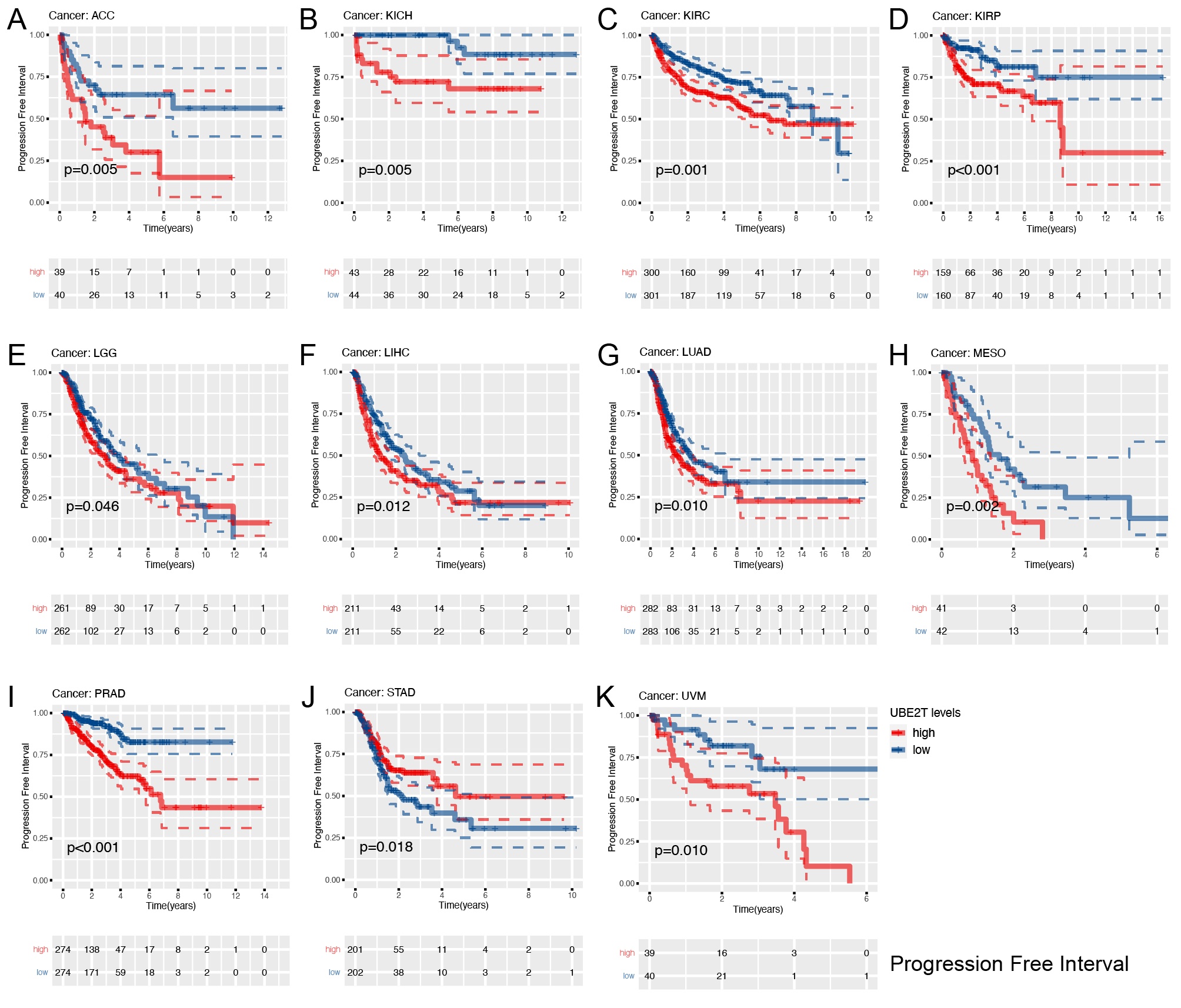 - Additional file 5: Figure S5. Association between UBE2T gene expression and progression-free interval (PFI) of 33 different types of tumors in TCGA database. A-K. The significant association between UBE2T and OS of ACC (A), KICH (B), KIRC (C), KIRP (D), LGG (E), LIHC (F), LUAD (G), MESO (H), PARD (I), STAD (J), and UVM (K). (TIF)