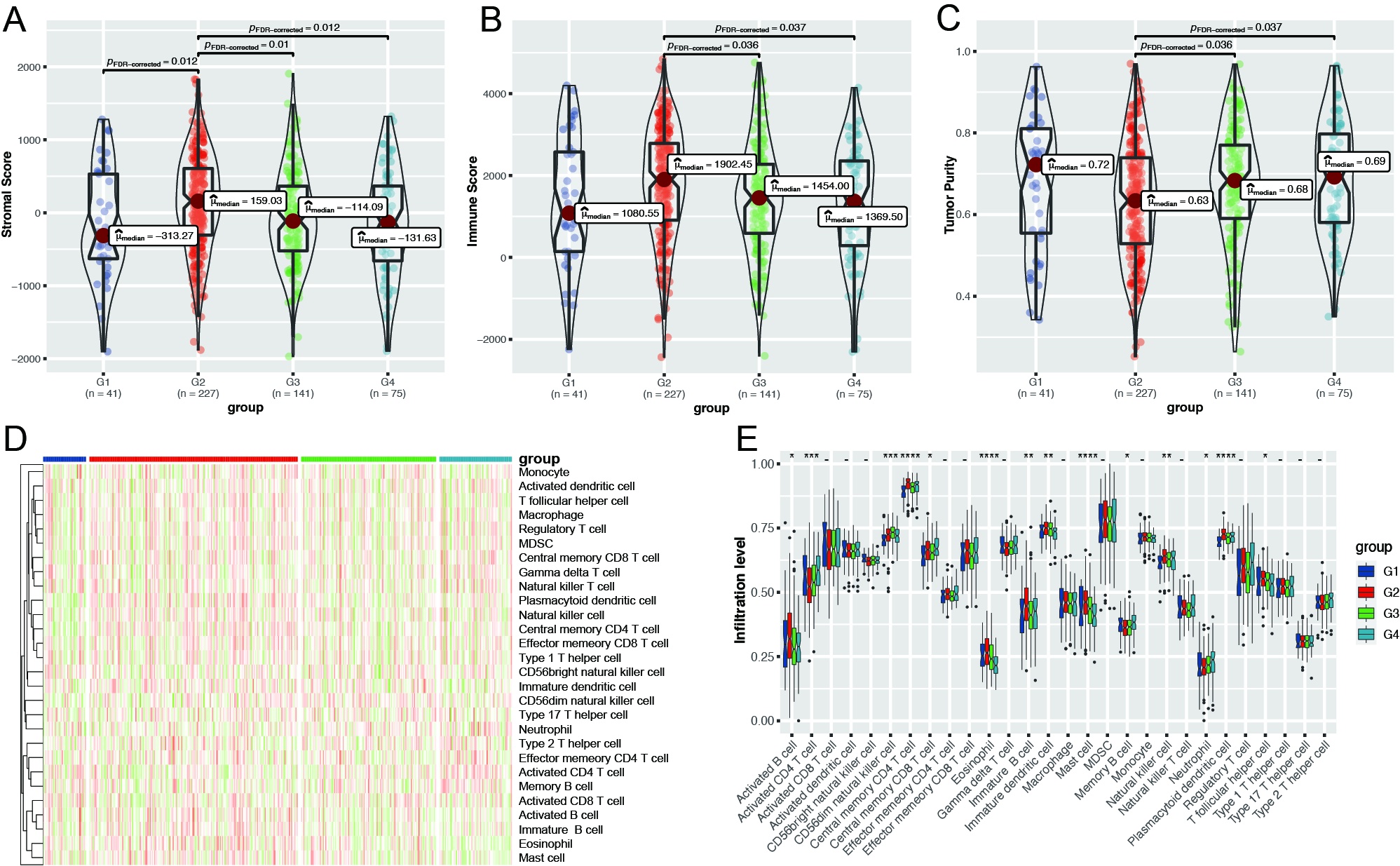 - Additional file 6: Figure S6. Validation of discrepancies in tumor immune environment among the four UrCCG subtypes in ICGC-LUAD cohorts. A-C. Differences in the stromal score (A), immune score (B), and tumor purity (C) (Kruskal–Wallis test). D. Heatmap of 28 types of infiltrating immune cells. E. The fractions of 28 infiltrating immune cells were compared among G1-G4 subtypes. (TIF)