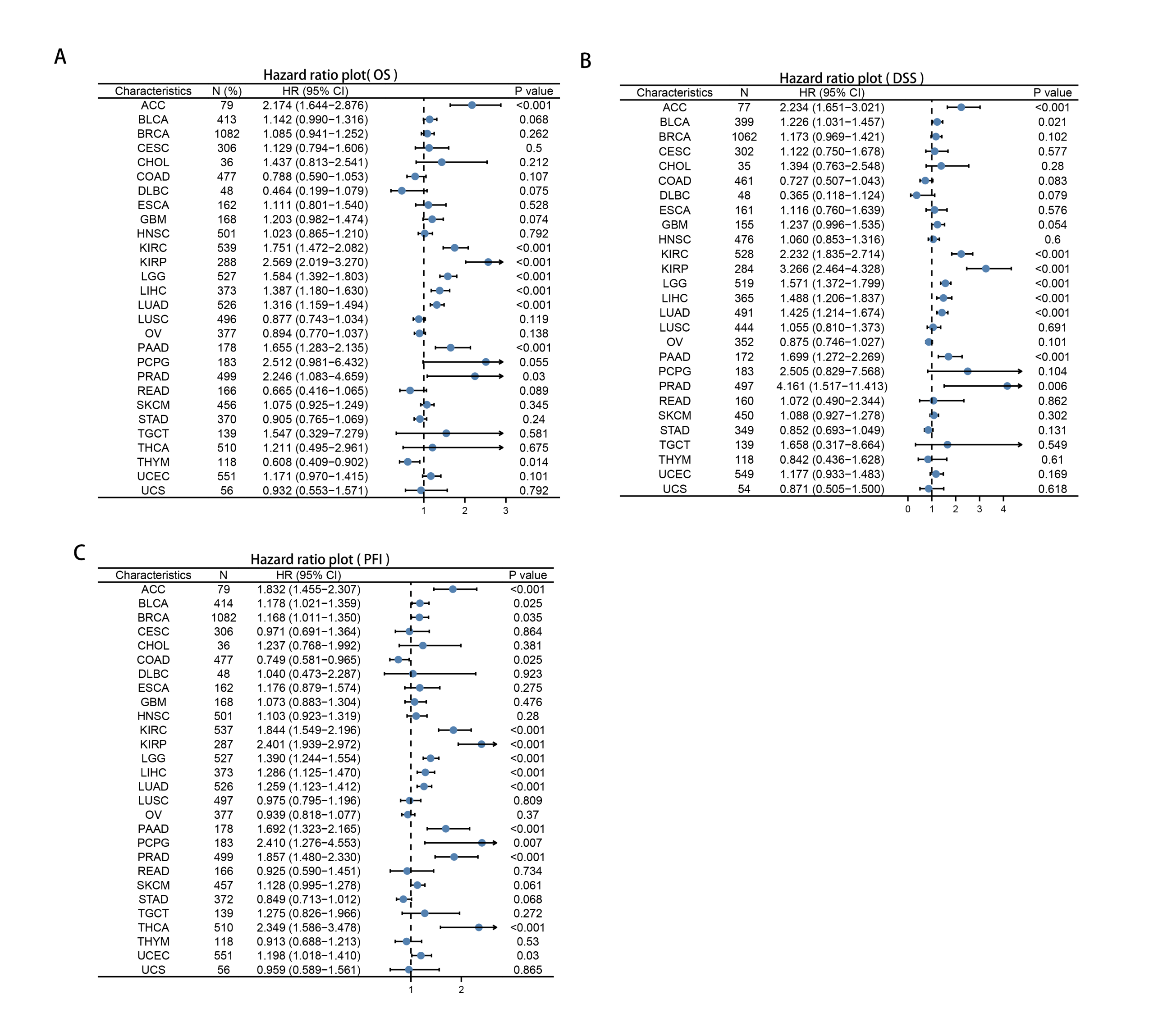 - The Forest plot showing OS, DSS, PFI after univariate Cox analysis in pan-cancer(A)OS, (B)DSS, (C)PFI. (PNG)