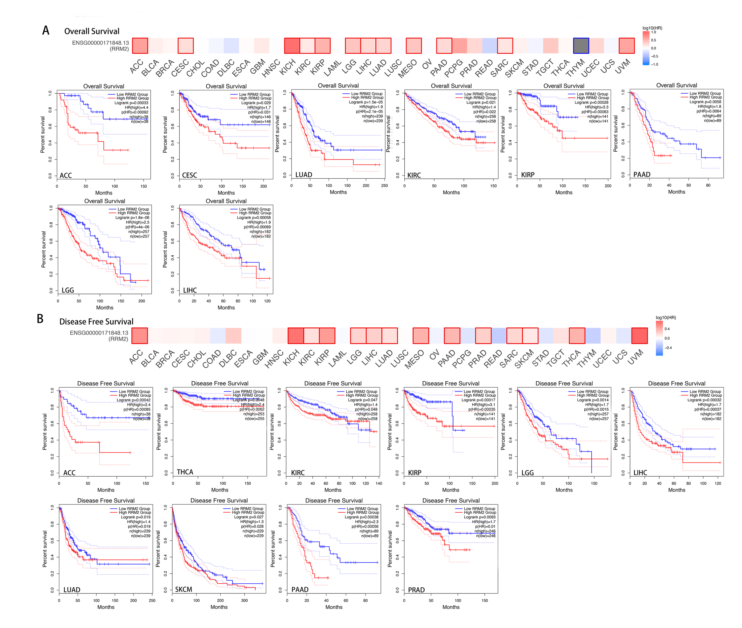 Cox proportional hazards model and Kaplan–Meier analysis were used to comprehensively evaluate the association between RRM2 expression and survival time. The results of univariate and multivariate Cox regression analyses suggested that increased RRM2 expression may be associated with shorter OS, DSS, and PFI among KIRP, ACC, KIRC, PAAD, LGG, LUAD, LIHC and PRAD. Kaplan–Meier survival curves of prognostic value analysis revealed that high RRM2 expression predicted poorer OS in ACC, KIRC, KIRP, LGG, LIHC, LUAD, and PAAD, indicating that RRM2 is a risk factor in these cancers. Notably, these results identified RRM2 as a carcinogenic marker for ACC, LGG, KIRP, LIHC, KIRC, PAAD, and LUAD prognosis, regardless of the prognostic algorithm. In addition, ROC curve analysis revealed that RRM2 performed well in the diagnosis of as many as sixteen different types of tumors, especially in CHOL (AUC = 1, 95% CI [1–1]) and UCS (AUC = 1, 95% CI [1–1]). These findings suggest that high RRM2 expression is primarily responsible for carcinogenesis in the majority of tumor types, adding fresh insight to the primary pathogenesis of various tumors and providing an innovative clinical biomarker that can predict the overall survival of cancer patients.