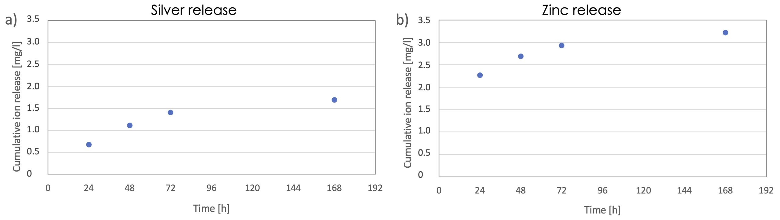 Ag and Zn release at different timepoints are in Fig. S1. Results showed that release of both metals progressively increased up to 7 days, when a sustained release was still measured. No significant differences were noticed in the release profile of the two metals except for the differences in the extent of release of the two metals, being higher for zinc.